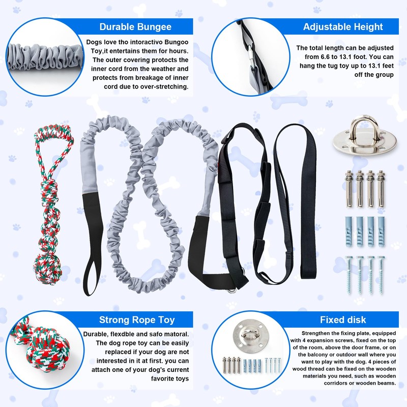 - Outdoor Bungee Tug Toy: Our dog toys are suit for indoor play, outdoor courtyard, camping outside, and etc. Hang it on your door or tree, You can adjust the height of the bite toy by the buckle, loop it and pull it snug. The total length is up to 19ft.Reinforced extension belt, three seamreinforcement, precise wiring, good wearresistance, and strong tensile strength.
