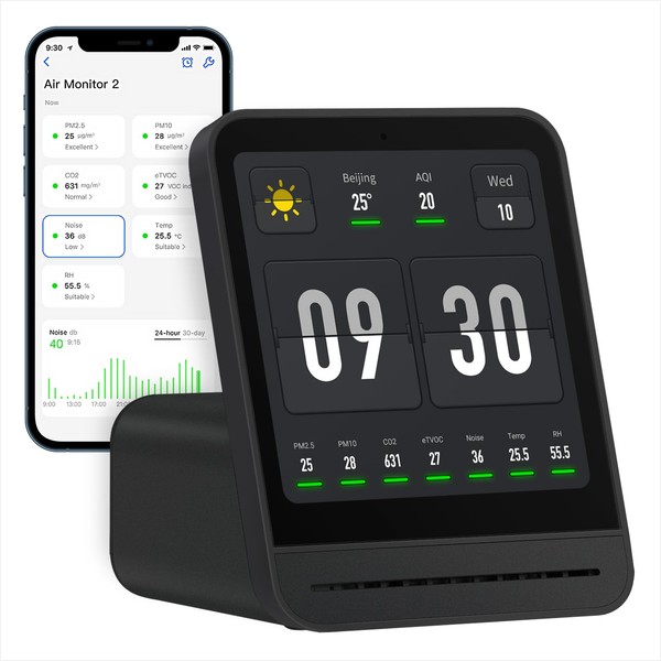 - 【Multifunction Air Quality Detector】The Qingping Air Monitor 2 provides real-time monitoring of 7 metrics, including temperature, humidity, CO2, PM2.5, PM10, eTVOC and noise level. Additionally, the screen displays the date and time. The product has an alarm clock function that supports setting multiple alarms to meet daily routines.