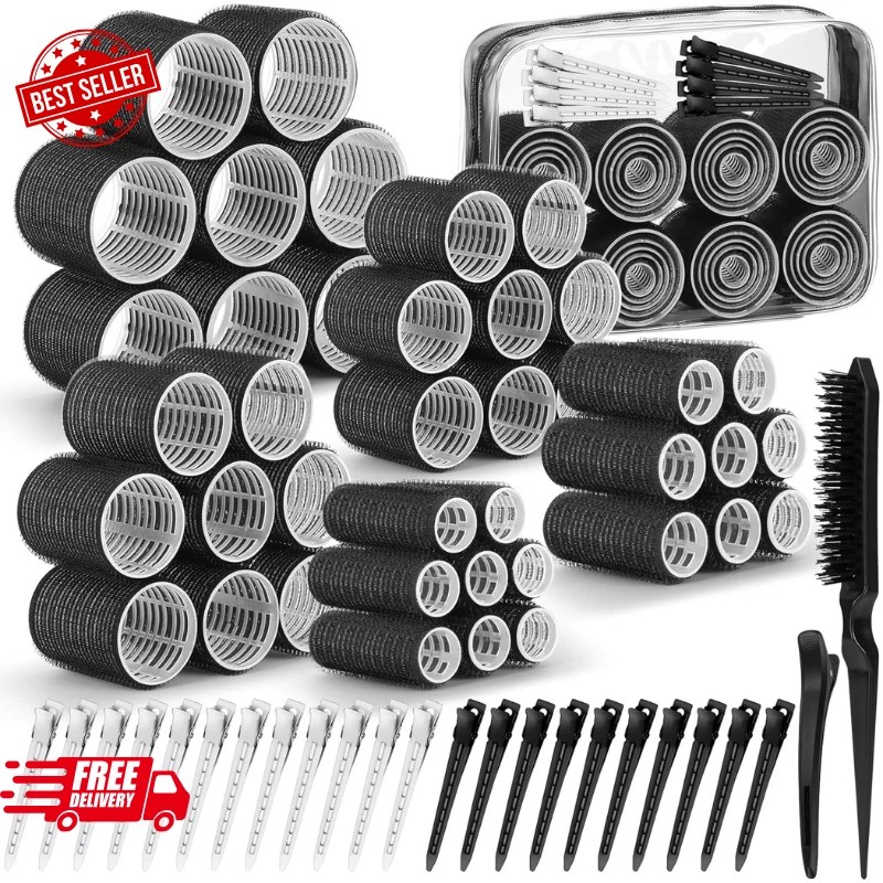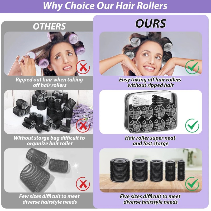- 【Great Value Curler Rollers Set】You will get 40 pcs hair rollers, 22 pcs hair clips, 1 pcs teasing brush, 1 pcs hair section clips, and 1 pcs storage bag. Black hair rollers set including 5 different sizes 8 pcs jumbo sizes 2.16inch, 8 pcs large sizes 1.88inch, 8 pcs medium sizes1.57inch, 8 pcs small sizes 1.25inch,8 pcs x-small sizes 0.98inch. Multiple sizes self grip hair rollers create beautiful curls and waves and various styles for women