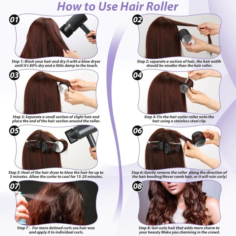 - 【Easy to Use】Keep hair about 80% dry, take a section of your hair put the hair curlers in the hair end, and roll it up towards your scalp. Secure the hair rollers with hair clips and wait patiently for 30 minutes or longer. Next, remove the hair rollers in the direction of hair bending. Don't pull hard, otherwise your hair will get tangled. You can apply hair wax to make your curls more shiny!
