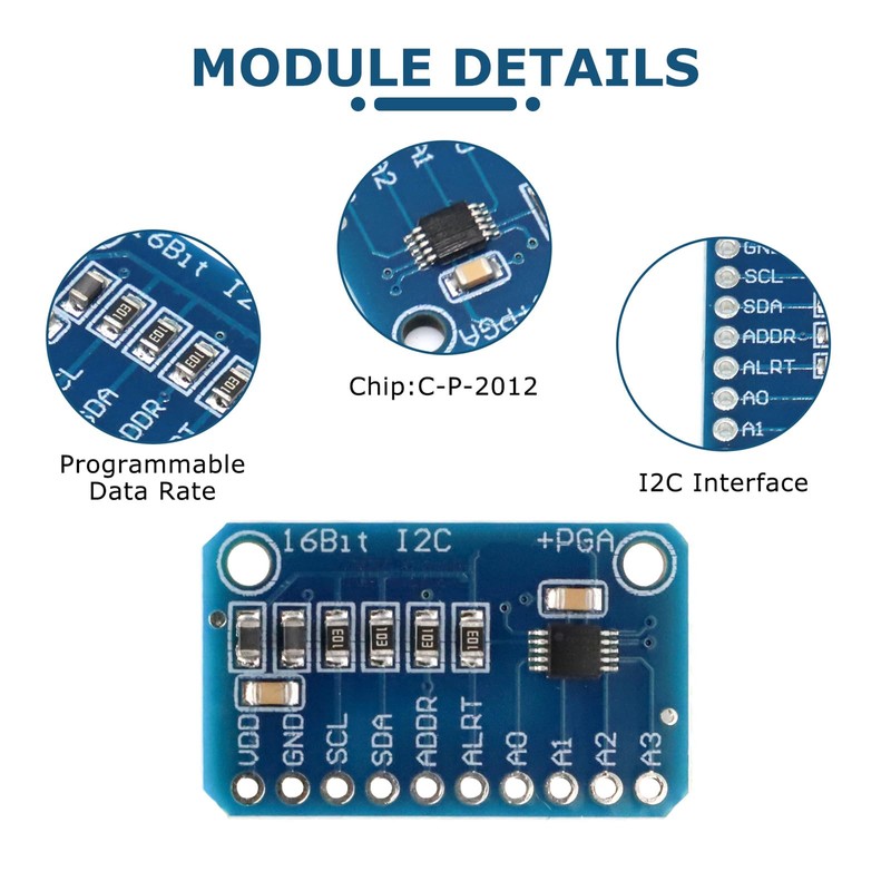 - The analog-to-digital converter features a 16-bit resolution and an I2C interface for easy control