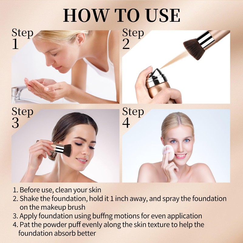 Airbrush foundation,the powder is smooth and fine,providing light to medium buildable coverage for the face,helping to adjust skin tone,reduce fine lines,cover facial blemishes,and present a smooth and bright makeup.1.Moisturizing formula,magic mineral airbrush Foundation uses a luxurious moisturizing formula to hydrate and moisturize the skin,leaving it looking smoother with a silky dewy finish.Suitable for all skin types.2.Easy to use and lasting,use airbrush foundation to easily create a professional spray effect,without the need for spray equipment,simplifying your makeup routine;the texture is skin-friendly and has strong makeup staying power,which can maintain a delicate foundation makeup all day long.3.Light and breathable,the mist sprayed by the airbrush foundation can cover the face silky and flawlessly without creases and floating powder.The makeup feels light,breathable,gentle and comfortable,creating a soft and matte elegant makeup.