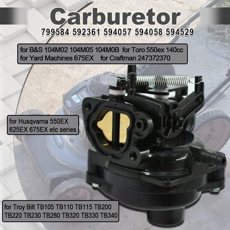 - Compatible With: Carburetor for Briggs and Stratton 104M02 104M05 104M0B, for Toro 550ex 140cc mower, for Yard Machines 675EX, for Craftman 247372370, for Troy Bilt TB105 TB110 TB115 TB200 TB220 TB230 TB280 TB320 TB330 TB340, for TB370 TB554 11A-A2BM766 11A-A2BM711 11A-A230711 11A-A23O71, for Husqvarna 550EX 625EX 675EX 725EXl LC121P F 09P702 103M02 500 500e 550E 625e 675 09p000 plus 575ex series