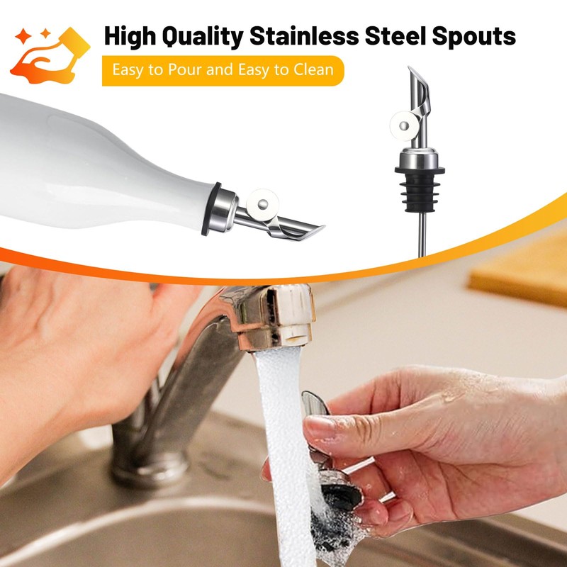 - 【Manövrierbarer Ausgießer】: Der sorgfältig entworfene Schwerkraftausgießer mit automatischem Flip-Top-Deckel verfügt über eine leicht zu kippende, leicht zu versiegelnde 304 Edelstahlkappe, die das Öl jedes Mal, wenn Sie es gießen, leicht abfließen lässt und das Volumen und den Fluss des Öls vollständig kontrolliert, ohne Probleme mit Verschütten oder Auslaufen zu haben. Dieses Design verhindert, dass Öl auf der Flasche zurückbleibt und Tische oder Arbeitsflächen verschmutzt.