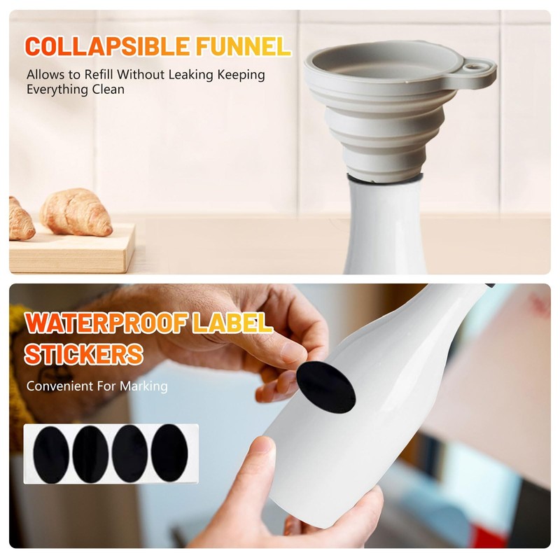 - 【Olivenölflaschen-Set】: Olivenölflasche mit Ausguss kann Olivenöl vor Sauerstoff, Licht und Hitze schützen. Der einfach zu faltende Trichter ermöglicht es Ihnen, die Flasche mit Olivenöl schneller zu füllen, und die 4 fettdichten Aufkleber können die Öl- und Essigspenderflasche personalisieren.