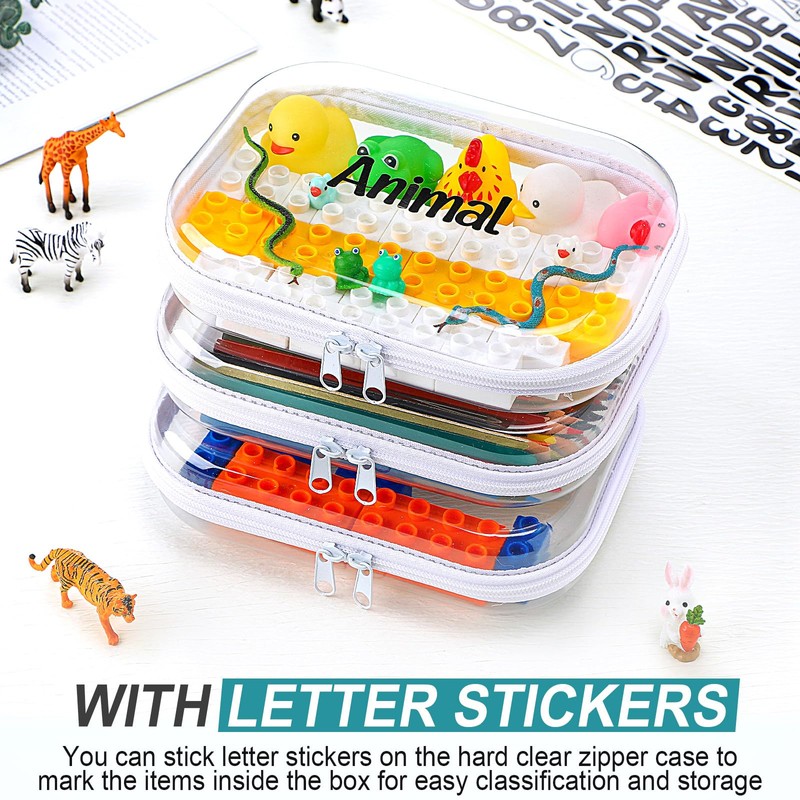 Qiyaz 12 Pcs Clear Hard Zipper Case Plastic Zipper Pouch with 5 Sheets Alphabet Stickers Double Toy Storage Organizer Bins Makeup Case for Travel Building Blocks Puzzles Cosmetic(7.87 x 5.9 x 2”)