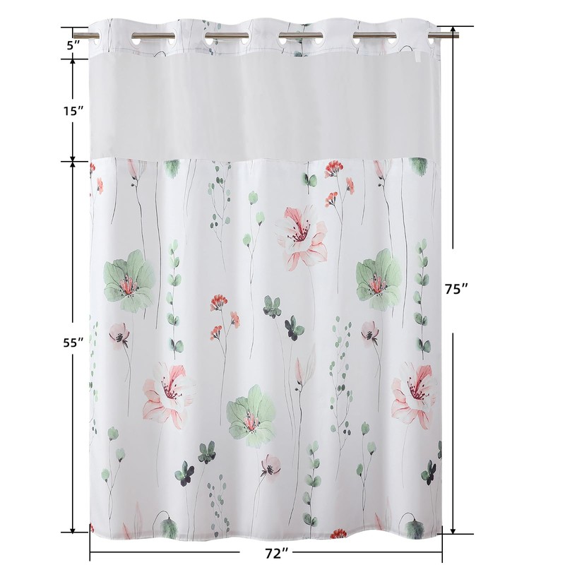 QiyI Flower Shower Curtain with Snap in Liner, Sage Green and Pink Watercolor Floral Cloth Bath Curtain, No Hook Shower Curtains with Mesh Top Window, Waterproof Bathroom Curtain Set, 72 x 75 Inch