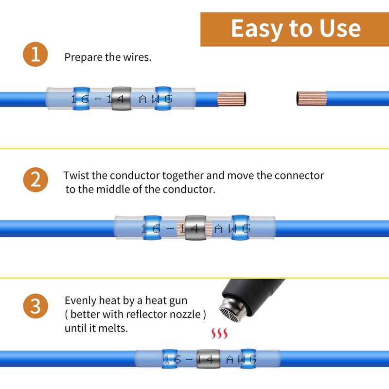 - Easy to Use: Wire connectors can be connected with just a heat gun, no crimping tool or soldering machine is needed
