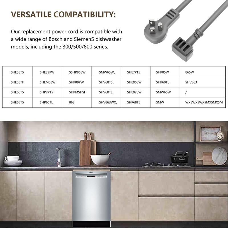 - Versatile Compatibility: Our replacement power cord is compatible with a wide range of Bosch and Siemens dishwasher models, including the 300/500/800 series, SHE53T5、SHE53TF、SHE65T5、SHE68T5、SHE7PT5、SHE863W、SHE878W、SHE89PW、SHEM53W、SHEM53W、SHP65TL、SHP68T5、SHP85W、SHP68TL、SHP7PT5、SHP865W、SHP88PW、SHPMSHSH、863、865W、SMW、SMW65W、SMW65W、SHV68T5、SHV68TL、SHV863WX、SHV863 WX5WX5WX5MX5MX5M.