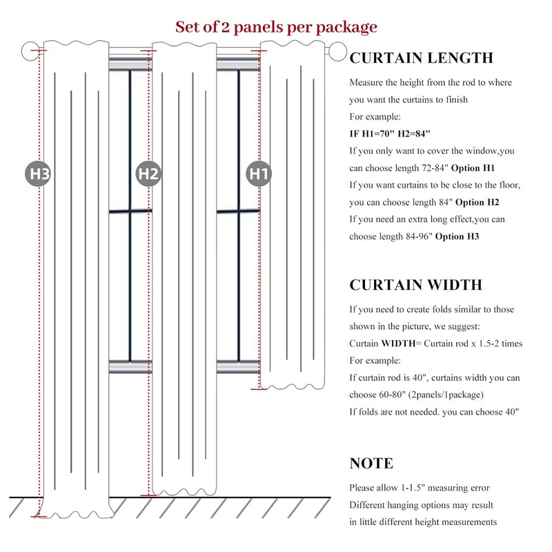 - Ready Made:Set of 2 pinch pleated curtain panels per package with 16 metal rings and 16 adjustable plastic hooks(The adjustable hook can raise and lower the height of the curtain by 1 inch),Each panel measures 40"W x 96"L,pair measures 80"W x 96"L
