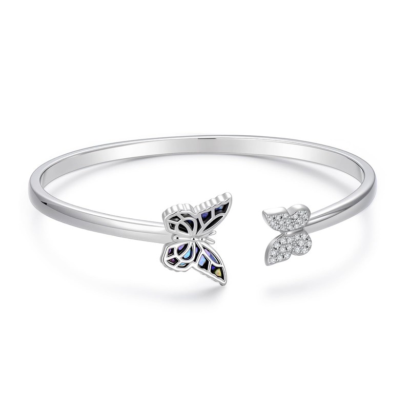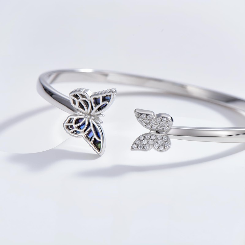 QKABTI Butterfly Cuff Bracelet for Women 925 Sterling Silver Abalone Shell Jewelry Elegant Butterfly Adjustable Open Bangle Birthday Gift for Her