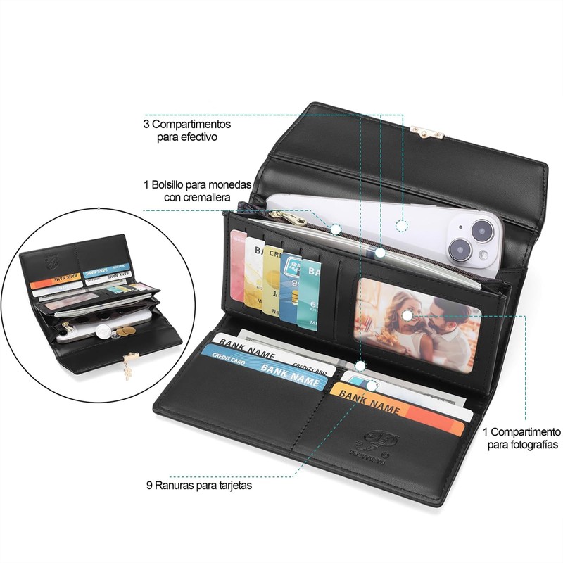 - Capacidad para 13 bolsillos: Este billetera grande para mujer con 9 ranuras para tarjetas, 2 bolsillos principales para dinero en efectivo/chequera, 1 bolsillo interior con cierre y 1 ventana de identificación transparente, es una billetera multifunción extremadamente poderosa, puede contener muchos artículos.