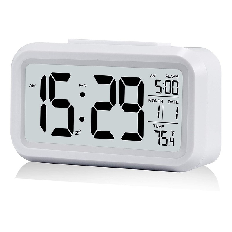 QKUDNGHY LCD Smart Digital Alarm Clock Battery Operated Desk Electronic Small Clock with Indoor Temperature,Date,Light Sensor,Backlight,Smart Night Light for Home Bedroom Kids Office (White)
