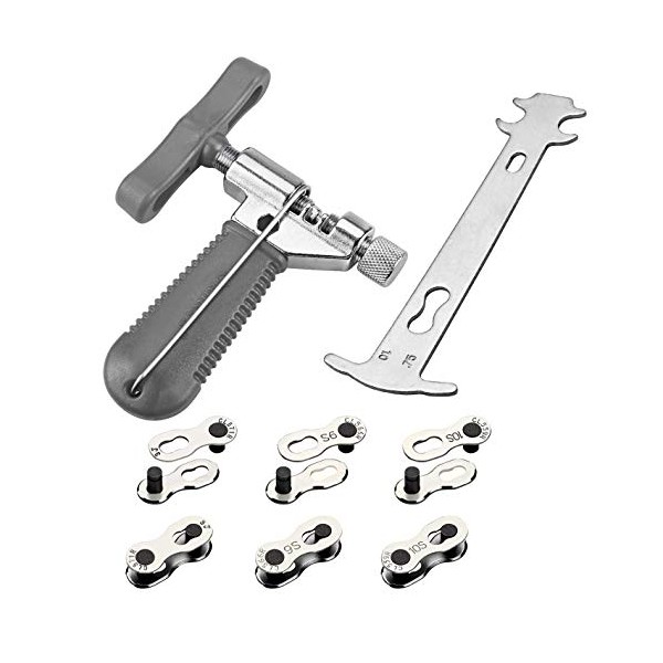 QKURT Bicycle Chain Tool Kit, 6 Pairs Bicycle Missing Link + Bicycle Chain Breaker + Chain Wear Gauge Bike Cycling Chain Mechanic Repair Tool Set for 6/7/8/9/10 Speed Chain Link Repair, Gray