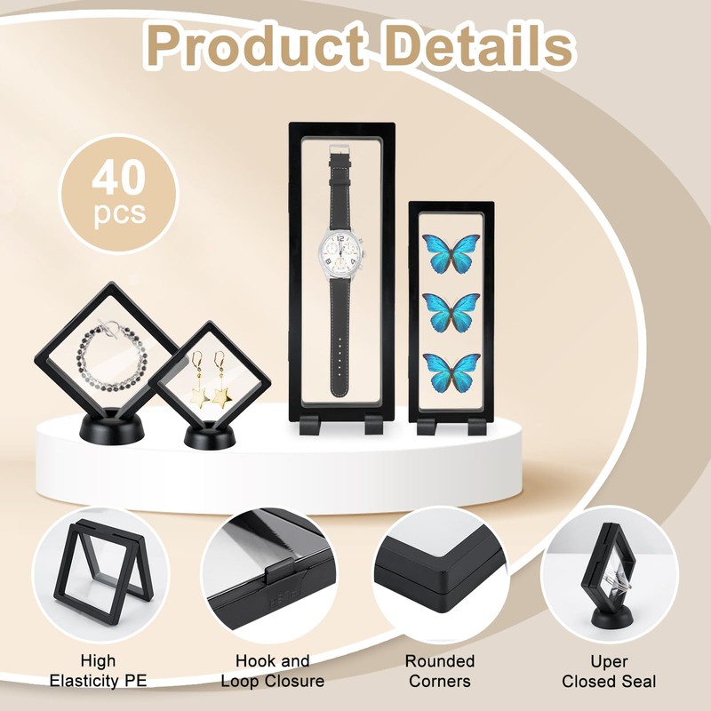 QLFJ-FurDec 40 PCS Floating Display Case, 3D Challenge Coin Display Holder Frames with Stands, Transparent PE Jewelry Storage Box for Butterfly, Medallion, Shells, Gems, Pins, Specimen (Black)
