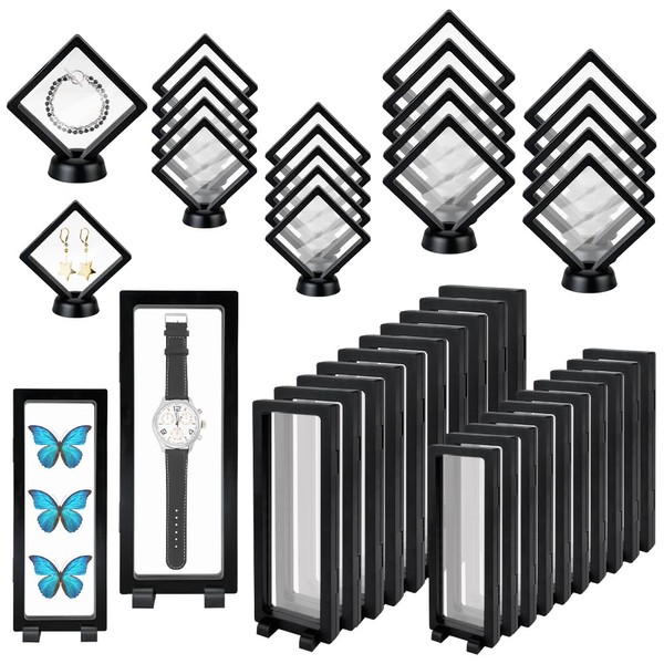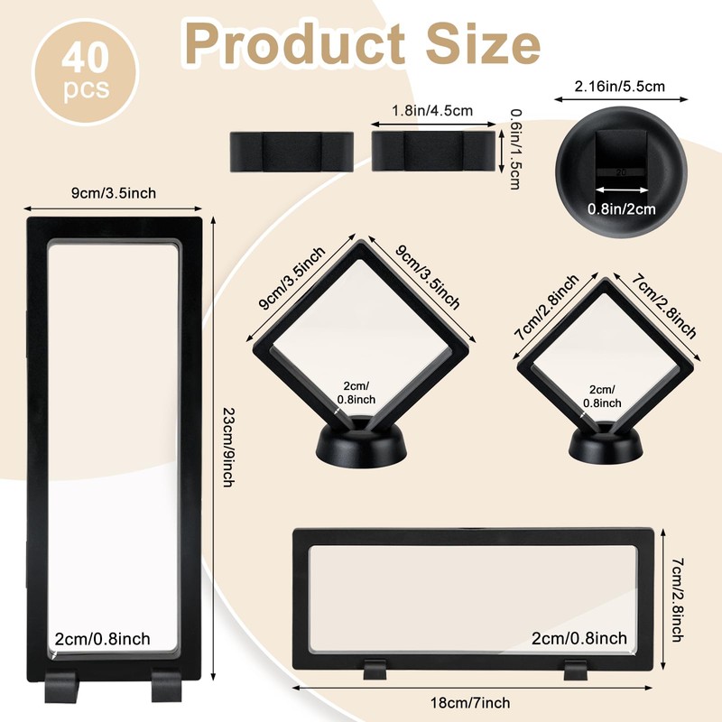 - 【Multiple Sizes】This floating frame display case set includes 10pcs of 23x9x2cm (9x3.5x0.8in), 10pcs of 18x7x2cm (7x2.8x0.8in), 10pcs of 9x9x2cm (3.5x3.5x0.8in), and 10pcs of 7x7x2cm (2.8x2.8x0.8in). Plus, it comes with 20 round bases and 40 square bases for flexible display options. Perfect for showcasing butterfly specimens, small artifacts, coins, jewelry, and other collectibles, this set meets all your display needs.