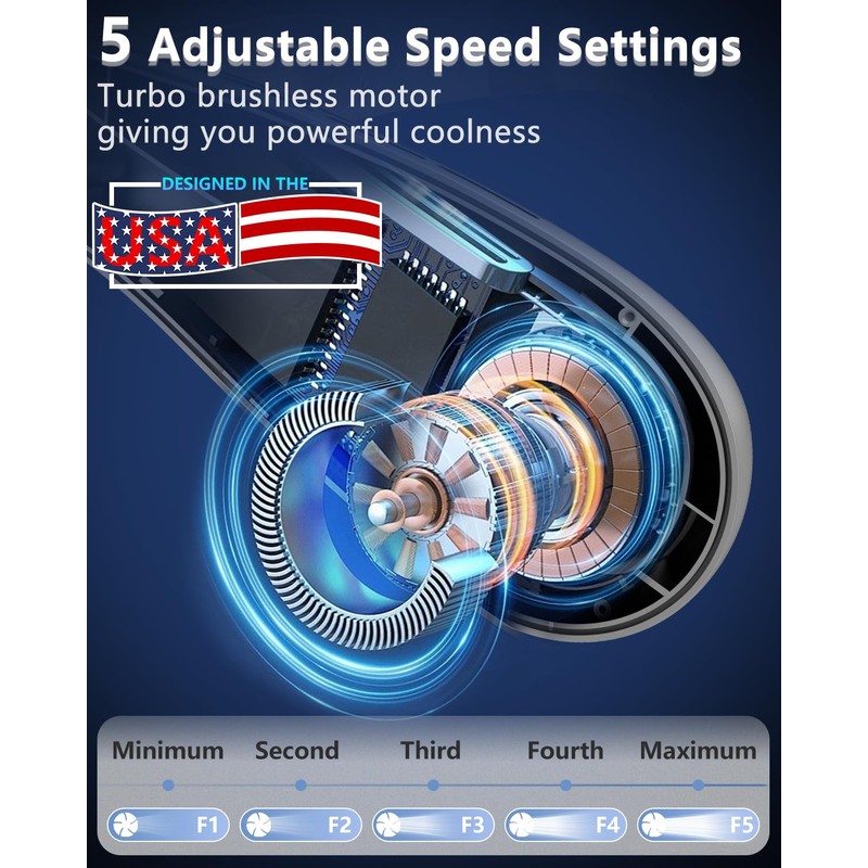 - 🌴【5-high Speed & Brushless Motor】Neck fans that blow cold air designed in the USA,equipped with advanced brushless motor technology,delivering gentler airflow and extended battery life.360°around air outlet provide wider range of airflow coverage that reaches your face and neck,give you refreshing and comfortable experience.Neck ac air conditioner offers 5 high speed fans that blow cold air:F1:Minimum, F2:Second, F3:Third, F4:Fourth,F5:Maximum