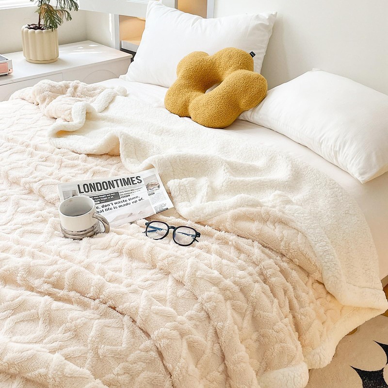 - DOUBLE SIDED BLANKET The QOFLY Sherpa blanket features a double-sided design with a 260GSM super soft and full jacquard on the front as well as a layered fluffy 230GSM Sherpa fabric on the back. The Jacquard Sherpa blanket offers the ideal balance between weight and warmth, so you always stay warm and cosy on cold autumn or winter nights.