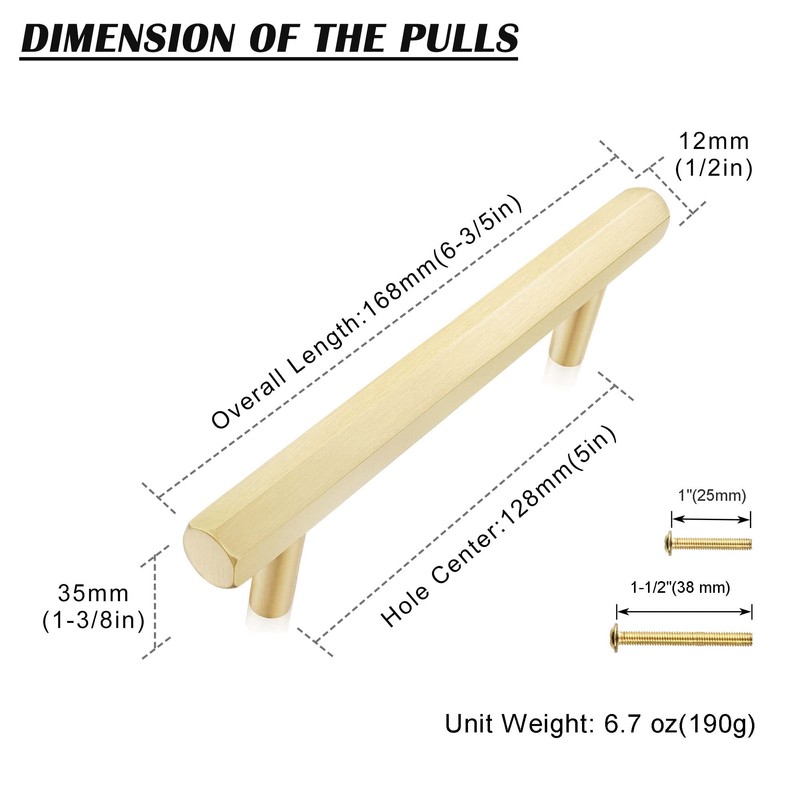 - Perfect Dimensions - With a hole center of 5-Inch(128mm), overall length of 6-3/5-Inch(168mm), width of 1/2 inch (12mm), and projection of 1-3/8 inches (35mm), these pulls are perfect for most cabinets. Each pull weighs 6.7 ounce(190g).