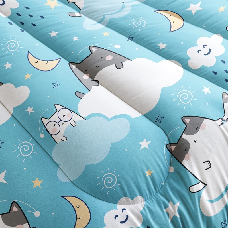 QOOMO Cat Comforter Twin Size,Blue Cloud Cats Comforter Set for Kids Teens Girls Boys,3Pcs Bedding Set Printed Comforter with 2 Pillowcases,Down Alternative,Soft and Lightweight,Twin Size