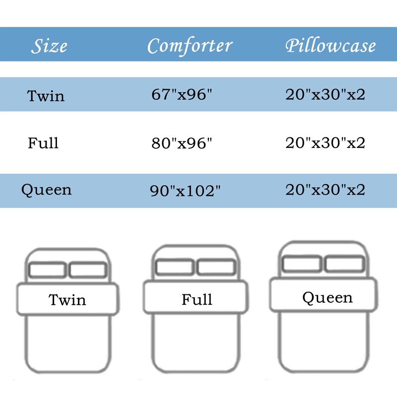 1 x Full Size Comforter 80" x 90" ; 2 x Pillowcases 20" x 30"
