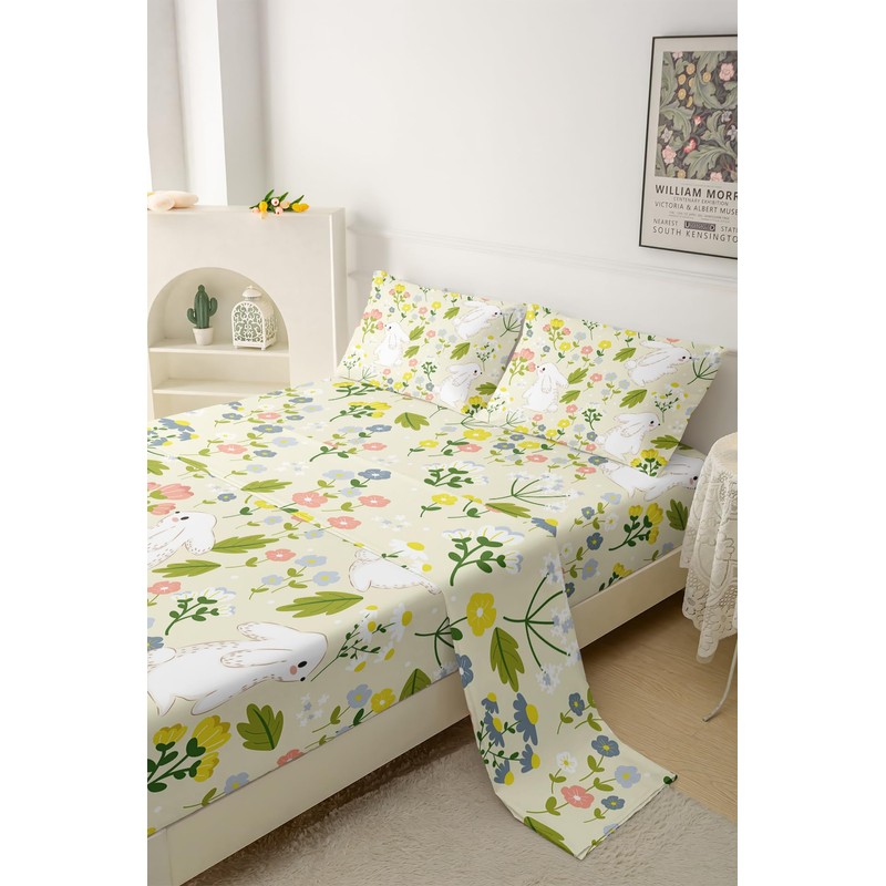 QOOMO Cute Bunny Microfiber Flat Fitted Sheets for Children Green Plants Beautiful Flowers Kids Sheets Set Wildlife Super Soft Kids Bedding Set Full Size 1 Fitted Sheet, 1 Flat Sheet, 2 Pillow Cases