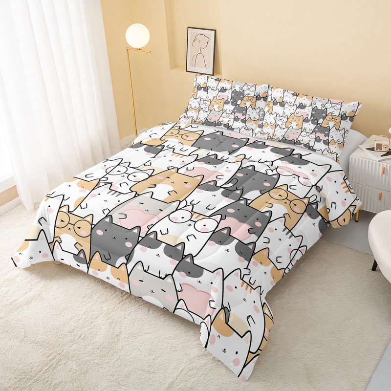 - 【Kawaii Cat Comforter Set】:Kawaii bedding set for kids.Twin size comes with 1 comforter(67" x 85") and 2 pillowcases(20”x30”). Full size comes with 1 comforter(80”x90”) and 2 pillowcases(20”x30”). Queen size comes with 1 comforter(90" x 90") and 2 pillowcases(20”x30”).THE SHEETS ARE NOT INCLUDED!