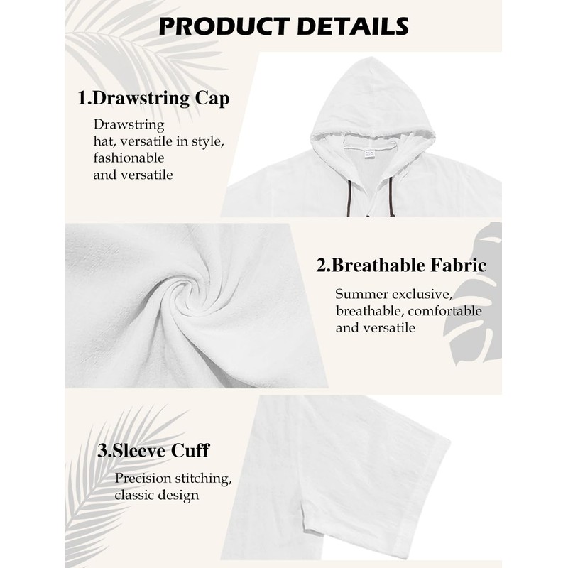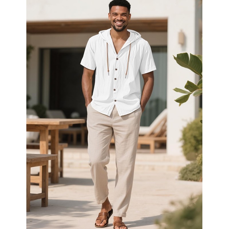 QOSOQ Men's Cotton Linen Shirts Short Sleeve Casual Sweatshirts Button Down Summer Beach Shirts with Hoodies(US, Alpha, XXX-Large, Regular, Regular, White)