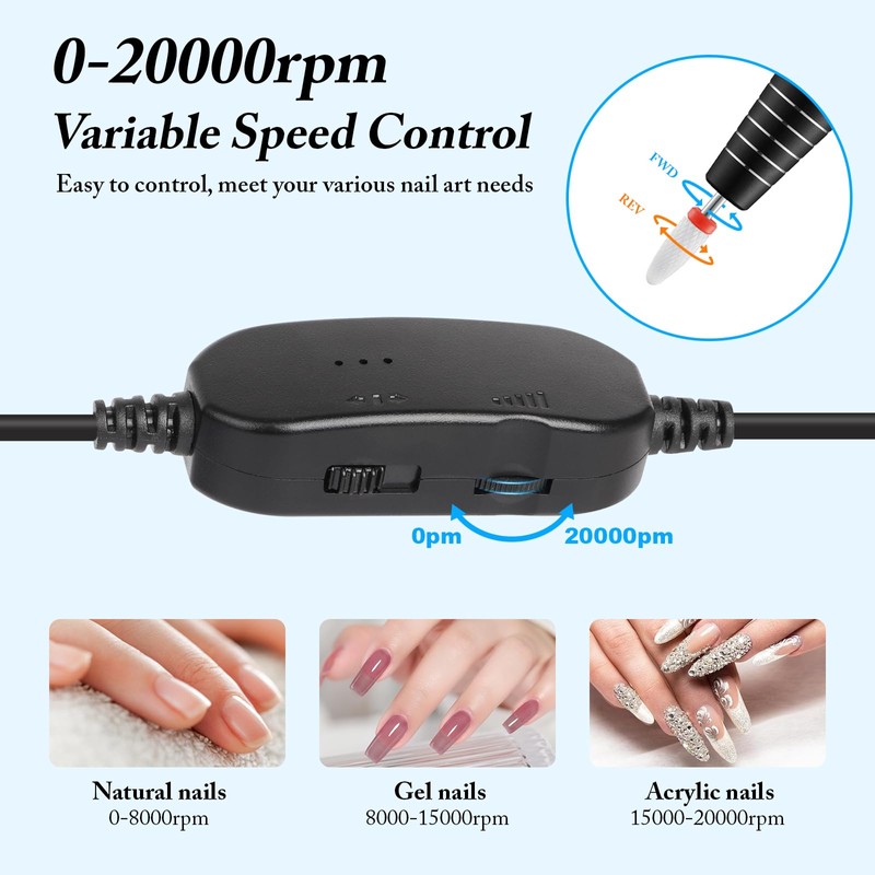 - Adjustable speed, powerful performance: QPVZX electric nail machine drill speed is adjustable, 0-20000 RPM, easily handle acrylic, rubber and dipped nails. Powerful performance ensures you can complete the work quickly and efficiently.