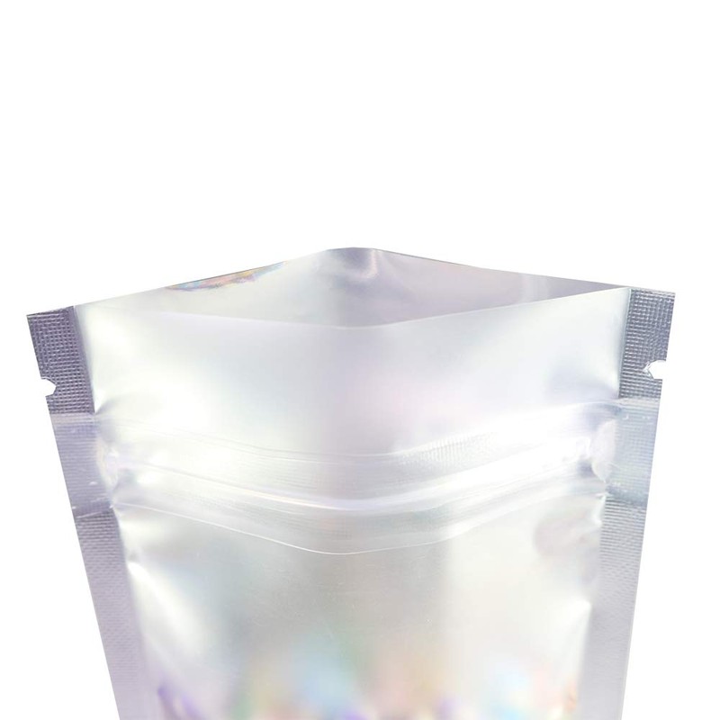 - Solid and Translucent- These pouches use both a solid colored metallized foil side and a translucent poly-plastic side. This combination provides the best of both worlds. It offers UV protection and space for printing on the solid side, and display for the products from the translucent side. You can also choose to print on the translucent side of the package.