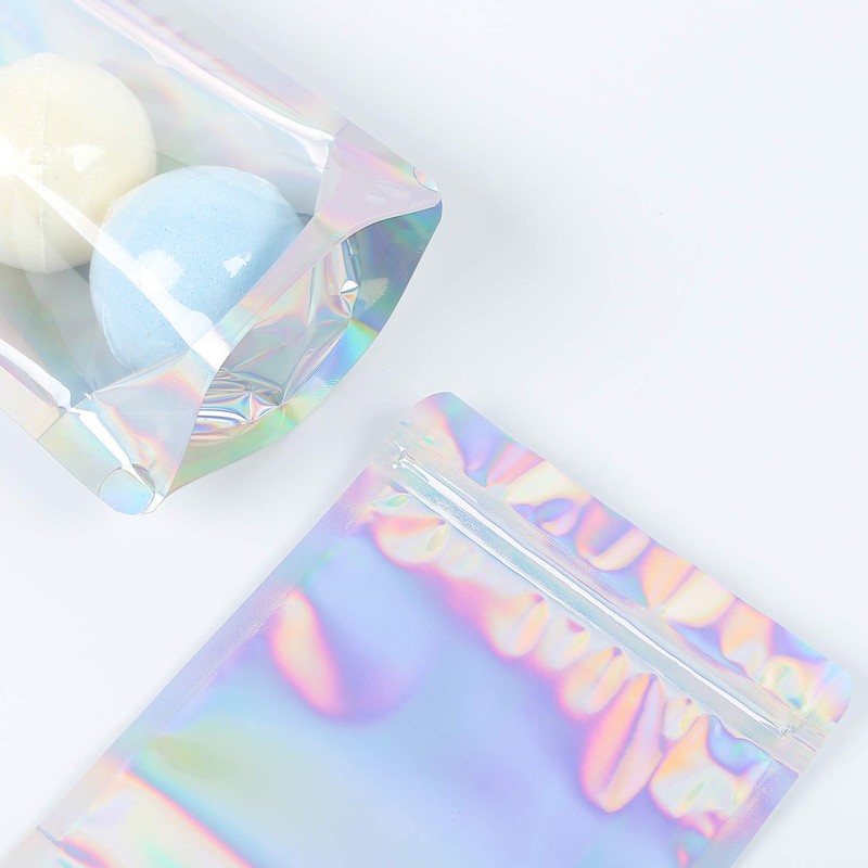 - Holographic- These foil pouches have a rainbow holographic design that moves and shifts as the angle you view the bags change. The animated design has a multicolored design that will hypnotize customers.