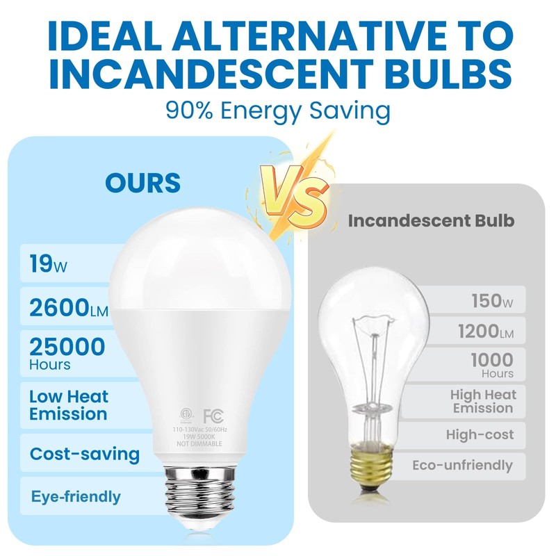 • 90% Energy Saving: Replace 100W 150W 200 watt incandescent light bulbs with our 19W A21 bright daylight LED bulb, slashing 90% on electricity costs. Note: Non-dimmable. Not for use with dimmers