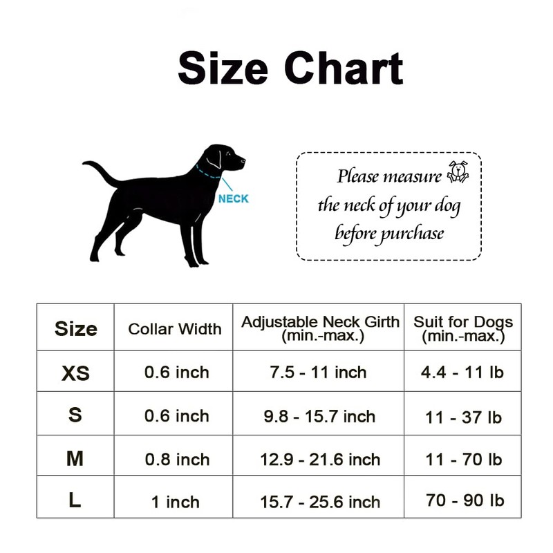 - Showing Pictures: All pictures are taken with our production samples from a size of Medium (Width 4/5", Neck 12.9"-21.6"). Please measure your pets carefully to make a safe and fit purchase. Always look at the size chart for the recommended neck girth and weight range to confirm the size.