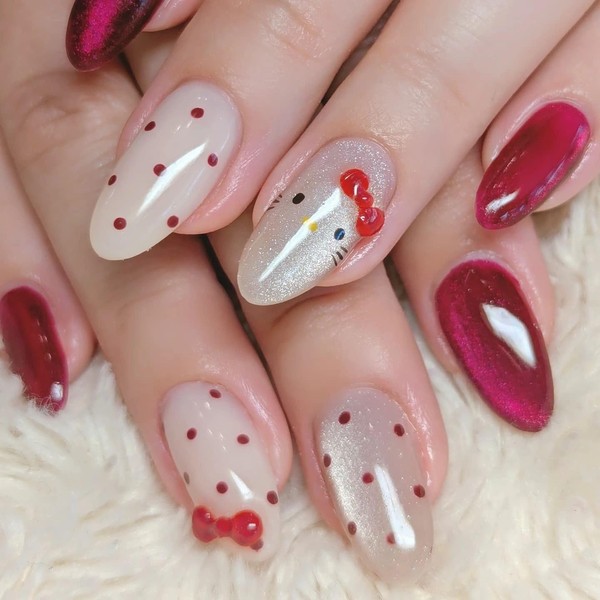 QQPPOLIU Cute Press on Nails Almond Shape with Polka Dots and Cat Design Short Red Fake Nails for Women Holiday