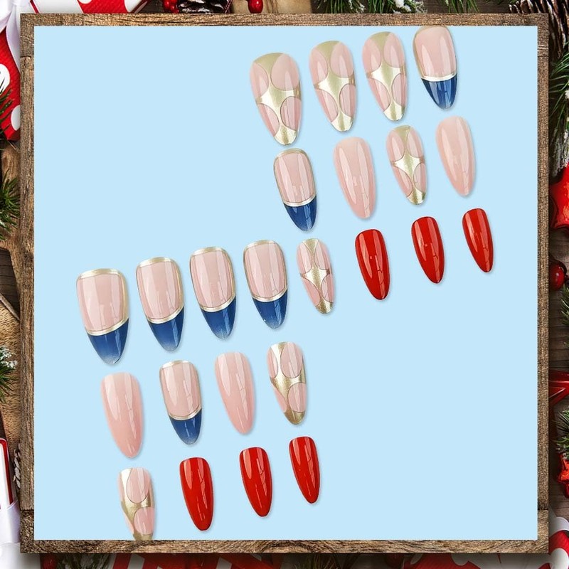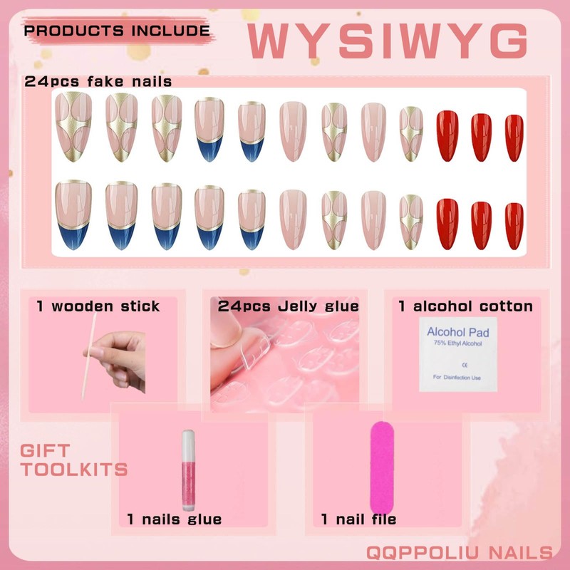 QQPPOLIU Short Press on Nails,Almond Press on Nails Medium with Metal Punk Design Red Press on Nails Medium Length Nails
