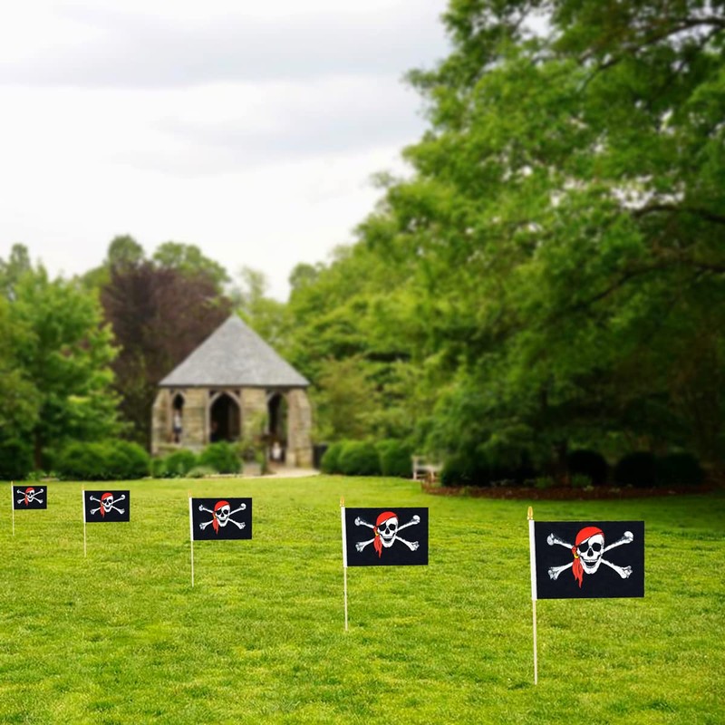 • [FEATURES]: Set of 12 Jolly Roger flags on stick, 5.5x8.2 Inch flag with 12.6 inch wooden stick