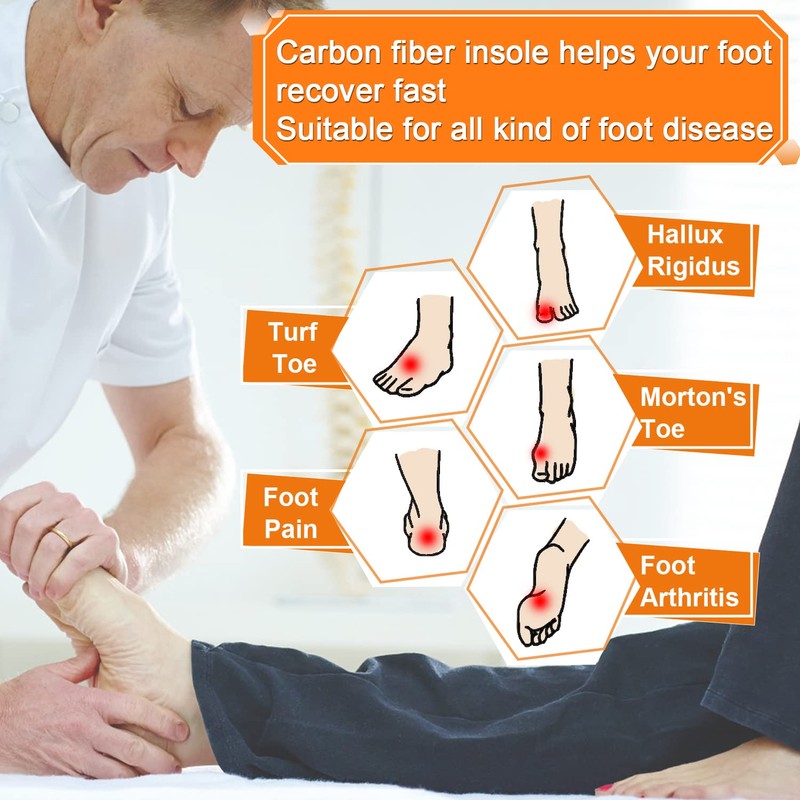 - .INJURY PREVENTION & TREATMENT: The carbon fiber insole is light in texture, and has good toughness and strength, Stiff shoe insole reduces flexibility and decreases range of foot motion.Carbon fiber insole helps your foot recover fast.This carbon fiber insole can help many foot problems like Hallux rigidus, turf toe, ligament strain, metatarsal fracture, toe fracture, Freibergs disease, Foot Arthritis, Sesamoiditis, Mortons Toe