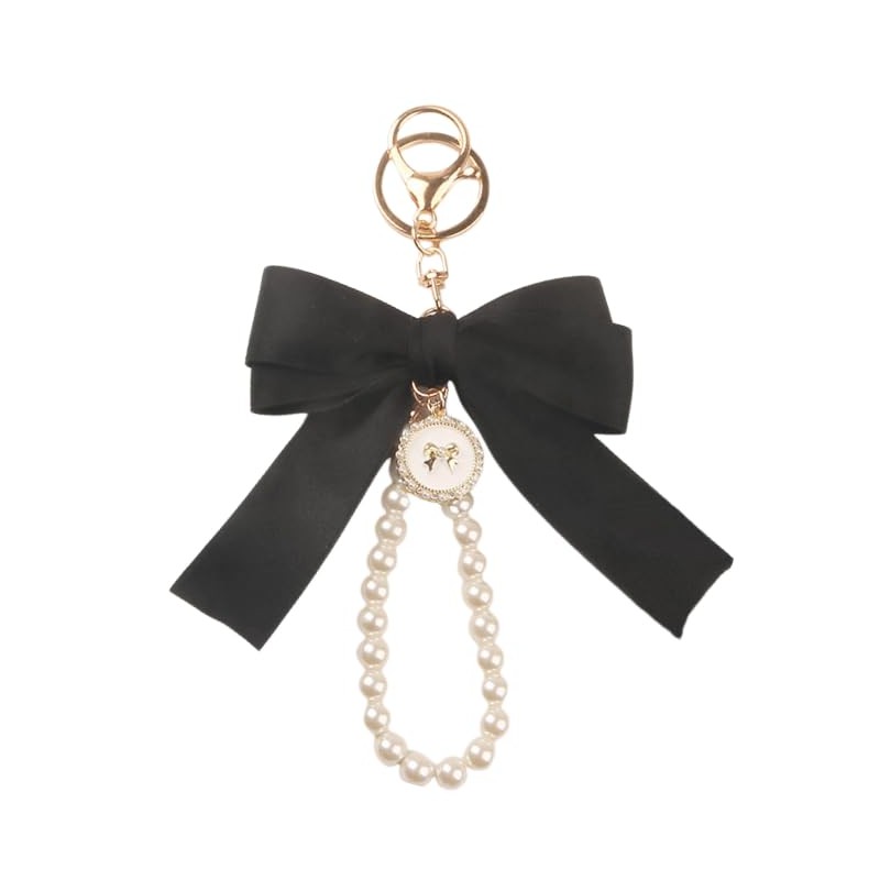 QRH Cute Lily Sakura Flower Keychain for Women Pearl Bow Key Chains Car Keys Holder Accessories, Black, Small