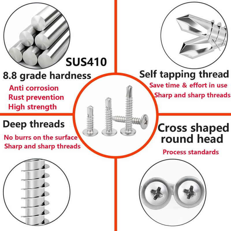 Fine Workmanship: The self-tapping screws are made of high quality stainless steel, strong and durable, with a smooth and burr-free surface, and their threads are very deep and clear, allowing them to easily penetrate metal plates while being resistant to deformation and slippage.