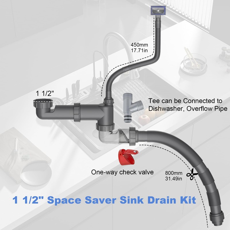 QruiLanTu Flexible 1 1/2" Pipe Kit for One Kitchen Sink Space Saving Kitchen Sink Drain Kit with Transparent Backflow Preventer P Trap for Kitchen Bathroom Restroom Laundry