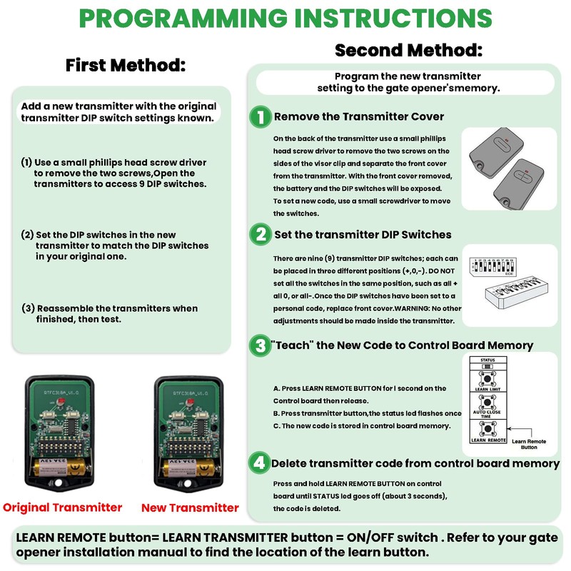 - 【Easy to Program】Manual included, just hold a screwdriver to open the black cover, set your own code, to match your original transmitter or gate opener. teach the control board to finish the work. perfect for an replacement as your mighty mule remote