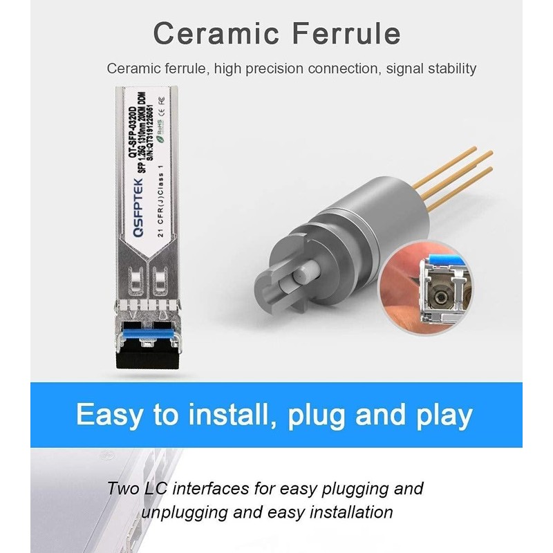 - Easy to use: easy installation, plug and play, supports hot plugging. Turn the ring lock down 90 degrees to unlock and then pull out the transceiver from the switch. High-quality metal material of the case, which ensures a long service life of repeated plugging and is durable.