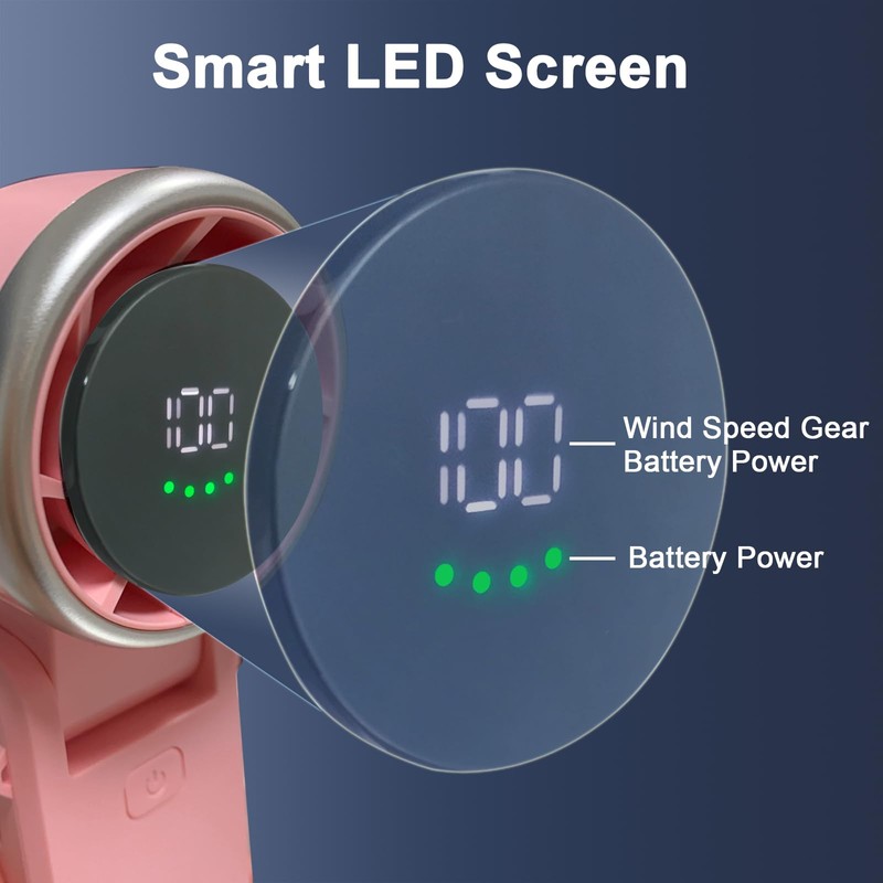 - 100 Stufen Turbo-Wind: Von sanften Brisen bis zu starken Winden bieten wir 100 Windgeschwindigkeitsstufen, die Sie anpassen können, um Ihre spezifischen Kühlbedürfnisse in jeder Situation zu erfüllen. Der kleine Ventilator verfügt über ein intelligentes Digitaldisplay, das den verbleibenden Akkustand und die Geschwindigkeitsstufe anzeigt