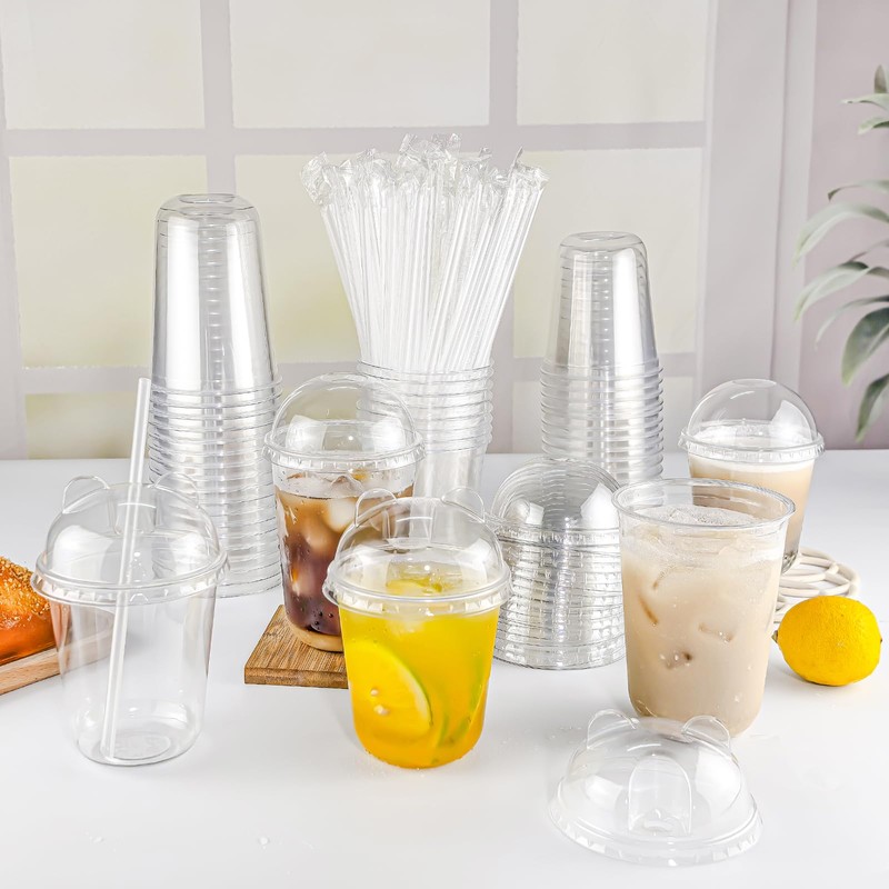 - 50 sets of 12oz clear plastic cups, dome lids, and straws - Perfect for large events or everyday use. Suitable for home made drinks, food delivery services, party events, and offices.
