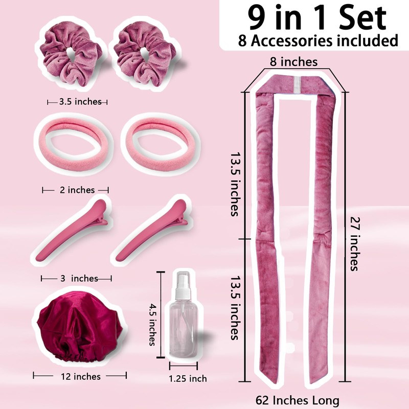 - Perfect Gift: this 9 in 1 hair curlers set include 1 vlevet headband, 2 velour scrunchies, 2 elastic hair rope ties, 1 satin silk like sleeping head cap bonnet, 1 spray bottle, 2 small claw clips. it’s perfect for mother daughter friends colleagues on Valentine' Day, Mother's Day, Birthday, Teacher's Day, Christmas and New Year