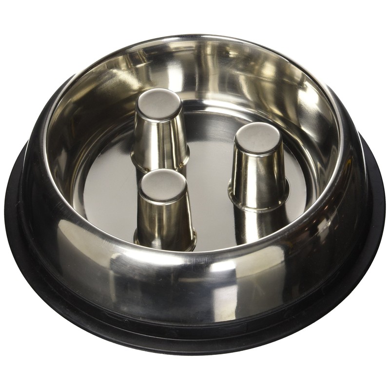 Patented Brake-fast dog food bowl with Anti Skid design prevents your dog from wolfing down their food. The simple obstructions make dogs slow down to eat and makes the animal feel more full, reducing instances of 're-eating'. The product is made in the U.S.A. out of recycled plastic and is Veterinarian tested and recommended. Bowls will hold kibble or canned food as the small can hold 1.5 cups, medium up to 5 cups and the large up to 8 cups.