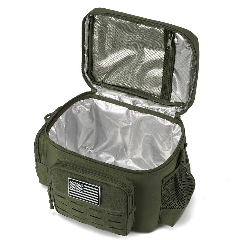 - 【Excellent Design】We've created an insulated lunch box with a blend of outdoor inspiration, giving it a fresh take on a classic military design. The Laser Cut Molle Webbing Design adds a special stylistic touch that sets it apart. The front pocket has a velcro patch area to personalize with different patches. This lunch box meets the needs of outdoor enthusiasts and military fans. It also makes a perfect gift for men, dads, husbands, boyfriends, and sons.