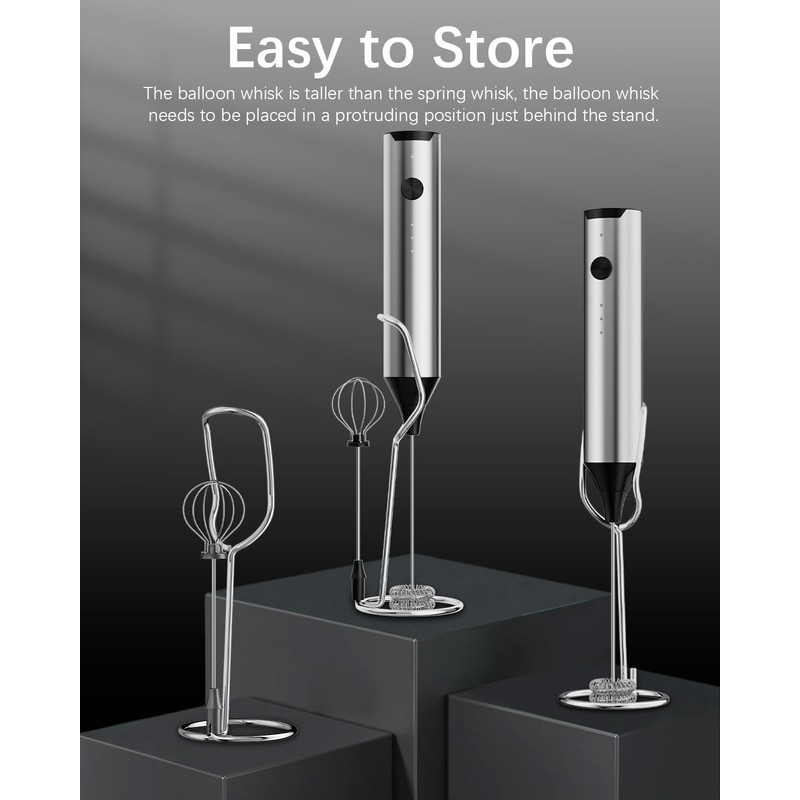 - Easy to Clean and Store: To clean this electric milk frother handheld with stand, simply place the whisk under water and briefly turn it on to get rid of any residue.When not in use, our electric whisk can easily fit in your bag or in your kitchen drawer.Please note that the body of the coffee frother handheld is not waterproof, so do not immerse it in water.