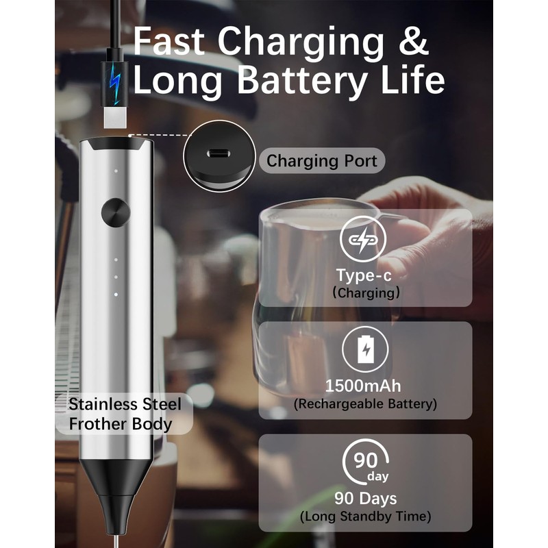 - Quick Charging: Our rechargeable milk frother comes with a type-c charging cable, which is convenient and fast to charge. A single charge can last up to a month, eliminating the hassle of frequent battery replacement, making it the perfect mixer electric handheld for a busy kitchen.