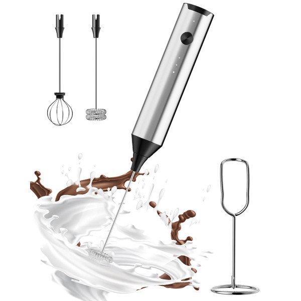 - 2 Stainless Steel Mixing Heads & 3 Settings: The handheld milk frother with a silver stainless steel body includes 2 detachable 304 stainless steel mixing heads, which can be easily switched to suit various kitchen usage scenarios. Rechargeable milk frother has an integrated button on the hand blender main unit with low/medium/high settings that you can control to achieve your desired milk froth result. (Note: No matter which gear it is in, long press for about 2 seconds to completely close the milk frother.)